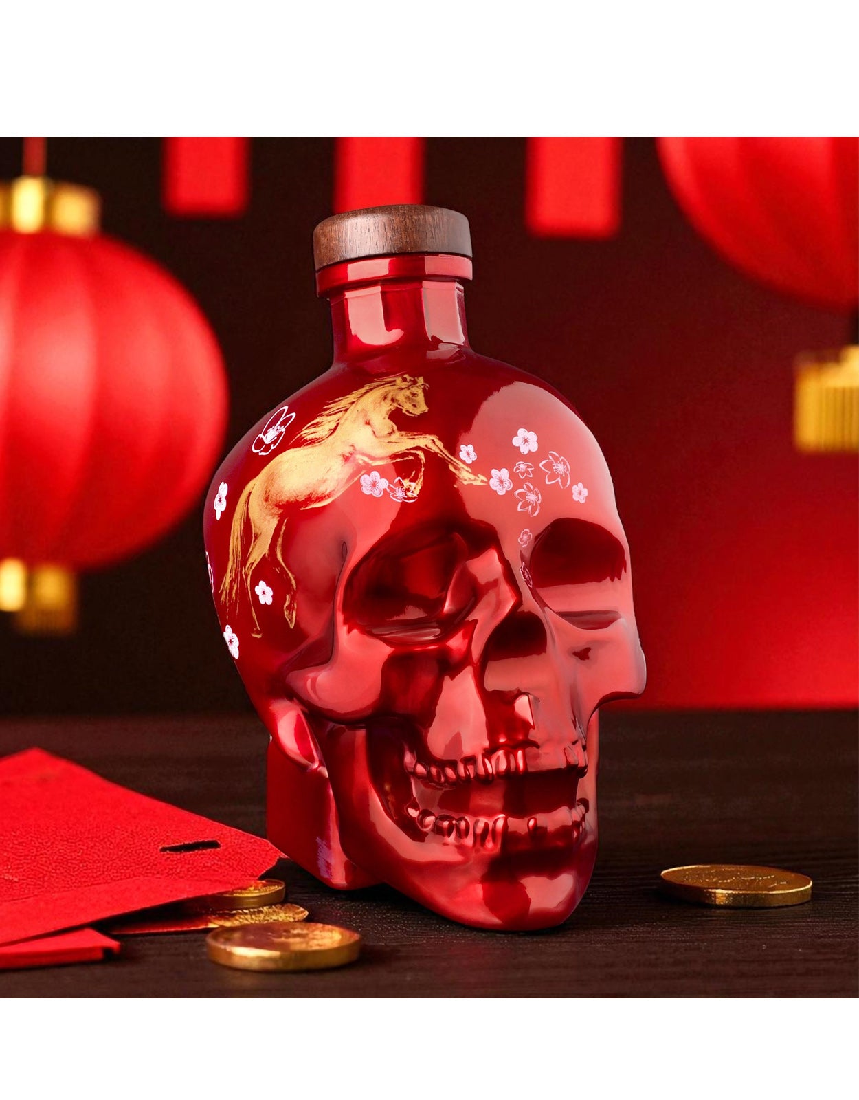 Crystal Head Vodka Lunar Horse is a limited-edition vodka celebrating the Lunar New Year, specifically the Year of the Horse in 2026. It is distilled in the country of Canada. The iconic skull bottle design was created by actor Dan Aykroyd and artist John Alexander. The limited-edition bottle is handcrafted by glass artisans and features a vibrant metallic red finish with gold foil artwork, honouring the Chinese zodiac tradition of the Horse, which symbolises freedom, energy, and perseverance.